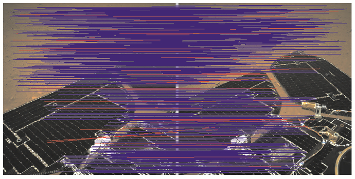 在图 8中,蓝色的连接线表示有效的匹配点;红色的连接线表示无效的匹配点。该立体像对是导航相机A、B在顶部环拍点拍摄的第6对立体像对。仅依靠控制点及其在图像上对应的像点无法保证自检校具备足够数量且空间分布均匀的像控点,特征匹配点坐标可以为联合平差(式(8))提供更多的观测值。此外,在立体模型条带平差中,引入控制点可以对加密模型点坐标进行修正,进而为联合平差提供更多数量、高精度且空间分布均匀的像控点。