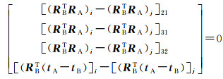 式中,RB是导航B像片的旋转矩阵;RA是导航A像片的旋转矩阵;TB是导航B像片的位移矢量;TA是导航A像片的位移矢量。下标i和j表示第i对立体像对和第j对立体像对。下标数字表示计算后所得矩阵的行、列号,例如:21表示所得矩阵的第2行、第1列。式(3)中包含了两对立体像对相关4张像片的外方位元素。