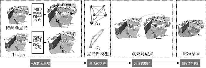 1 基于空间一致性的点云配准方法构建SCR主要包括候选匹配选取、图匹配求解、离群值剔除和变换参数估计4个步骤,如图 1所示。