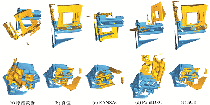 2.4 室内场景配准试验为验证SCR方法的有效性,配准试验展示了3种经典配准方法(ICP、FGR和RANSAC)和3种深度学习配准方法(PointDSC、DGR和3DRegNet)的配准结果。经典配准方法由Open3D库[31]提供,深度学习配准方法采用3DMatch数据集的训练权值进行配准,配准结果见表 3。