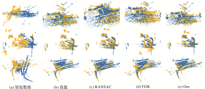 表 2前3行分别为RANSAC、FGR和3DRegNet原始方法的配准结果,后3行为图匹配结合3种方法的配准结果。虽然FGR原始方法与结合方法的平移误差相等,但由表 2可知,相较于原方法,结合图匹配的配准方法均具有更优的配准结果。综上所述,图匹配可作为特征匹配方法广泛地应用于基于特征的同平台点云配准,具有较好的适用性;图匹配方法通过利用几何结构约束对应点提取,提高同平台点云配准精度。