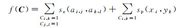 设C为邻接矩阵,若xi和yk为一组对应点,Ci, k等于1,否则为0,由定义可知C中元素为0或1。令ai, j为xi和xj间的欧氏距离,ak, l为yk和yl间的欧氏距离,空间一致性匹配方法目标方程f(C)由长度相似性se(ai, j, ak, l)和点相似性sp(xi, yk)组成,求解空间一致性匹配结果可表示为最大化f(C)