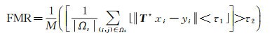 式中,Ωs为对应点集合,|Ωs|表示Ωs中包含的元素数量;x和y为点云三维坐标;T*为真实变换矩阵;τ1和τ2为设定阈值。式中符号