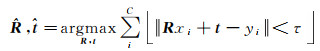 式中,xi和yi为点云三维坐标。通过奇异值分解方法获取式(8)闭环解[29],以此产生一组R,t用于假设验证。设定阈值τ,选择最佳变换参数