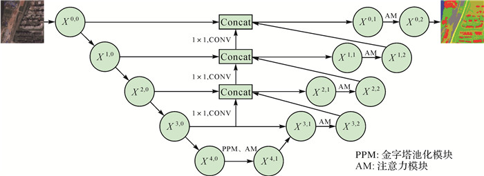 本文对存在的特征融合方案进行简化,提出了一种简单的多尺度跳跃连接来捕获不同层级的多尺度信息。如图 1所示,以X2, 1为例,编码器中分辨率较低的X3, 0通过上采样增加分辨率,在经过1×1卷积整合信息的同时减少通道维度。对解码器X3, 2上采样,相同分辨率的特征X2, 0、X3, 0、X3, 2进行维度拼接,实现特征融合与复用。上采样的方式可选择转置卷积与双线性插值,本文为避免较大的参数量,选择插值的方法恢复图像尺寸。该特征融合方法将不同分辨率的特征进行融合,低分辨率的特征对于语义信息表征能力强,高分辨率的特征对于细粒度的几何细节信息表征能力强,不同层次特征进行融合有助于分割出遥感图像中不同尺度的物体。