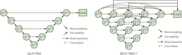 | 图 2 U-Net与U-Net++网络结构 Fig. 2 U-Net and U-Net++ network architecture |