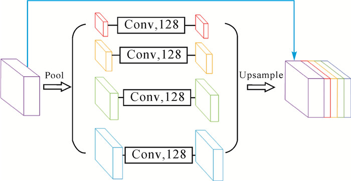 1.3 金字塔池化深层网络中,感受野的大小表明了使用上下文信息的程度,全局上下文信息有助于复杂场景理解,局部信息又有利于细节部分的恢复。文献[15]提出了金字塔池化来扩大感受野,融合全局图像级特征与局部特征,增加正确分类的可能性。PPM的结构如图 3所示,将主干网络提取到的特征图传入金字塔池化中,在不同池化步长下,输出不同大小的特征图。图 3中红色特征图为输入特征经过步长为8的平均池化层得到的输出结果,包含了全局图像特征;其余特征图是输入特征分别经过步长为1、2、4的平均池化层得到的输出结果,包含了图像中不同大小区域的图像特征。为了保持全局特征的权重,首先在每一个金字塔层后使用1×1卷积,并将通道维数减至128;然后通过双线性插值上采样到输入特征图尺寸;最后将不同级别的特征图与输入特征图在通道上拼接,实现特征融合及全局上下文信息的捕获,并传入后面的卷积网络中。