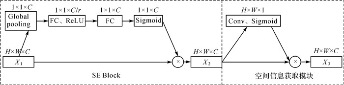 通道注意力机制,对通道间的依赖关系进行建模,自适应地学习和调整不同通道的特征响应[11],其中最典型的代表是SE-Net。本文在SE-Net的基础上,对其网络结构进行扩展,增加对空间依赖关系建模,让模型学习每个空间像素点上的关系,注意力模块网络结构如图 4所示。该模块由两部分组成,左边是SE Block,实现通道特征重标定;右边是空间信息捕获模块(spatial attention block),为特征图中不同位置分配不同的权重。