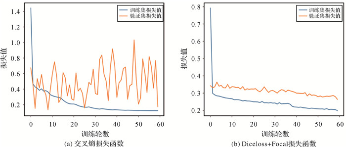 在语义分割任务中,常使用交叉熵损失函数来评价模型预测值和真实值之间的差异。本文试验数据集存在严重的数据不平衡现象,地物各类别占比见表 2。WHDLD数据集中植被和水域占比之和高达70%,而道路和裸地的占比不足5%;LandCover.ai数据集中背景占比超过50%,建筑与道路占比均不足2%。数据集中类别占比不均衡,以及多类别交叉熵损失函数偏向于预测占比较大类别的特性会导致分割效果不佳,并且在网络的训练过程中,出现过拟合现象。如图 5所示,在相同的网络模型和试验配置下,使用多类别交叉熵损失函数时,随着迭代的进行,验证集损失存在严重的上下震荡情况,且无法收敛。使用本文引入的Focal Loss与Dice Loss相结合的损失函数,仅使用ImageNet预训练权重,不进行深度调参的情况下,就能有效解决该问题(平衡参数αt=0.25,聚焦参数γ=2,超参数a、b均设置为0.5)。