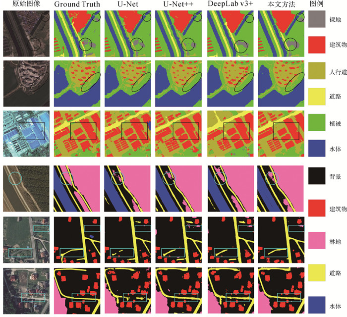 图 6为4种模型在两组数据测试集中选取的预测结果,整体来看,4种方法对于水体、植被(林地)和背景的分割效果较好,但是在其他类别的预测上存在较大差异。以WHDLD预测结果为例,从第1行圈中部分可以看出,对比的3种模型在裸地预测上存在漏分,U-Net和U-Net++将道路错分成人行道。这是由于植被稀少的林地和裸地、道路和人行道在外观上十分相似,本文方法中的金字塔池化能够提供额外的上下文信息,有利于复杂场景下的类别判定,提升相似物体的分割识别效果。第2行圈中的人行道分布散乱且细长,存在很大的挑战性,U-Net、U-Net++和DeepLab v3+都未能将其识别出来,说明本文使用的注意力模块能够关注细小物体,减少背景干扰,提高类别分割的稳健性。从第3行框中的建筑物和人行道来看,U-Net简单地将编码器和解码器分辨率相同的特征映射进行拼接融合,对细节部分处理效果很差,建筑物轮廓中存在明显的破碎斑块,U-Net++和DeepLab v3+在左下角不同建筑间存在粘连现象,右下角的建筑出现缺块,本文提出的多尺度跳跃连接能够有效缓解这种现象。LandCover.ai数据集的预测结果也能说明本文方法在正确分类和恢复物体细节方面优于其他对比方法。本文方法也存在不足:裸地、人行道的分割精度有待提高,存在错分和漏分;人行道和道路在外观和形态上极为相似,如何正确对其分类仍然存在很大的挑战性;建筑物轮廓部分细节恢复不足,存在破碎情况;弯曲细长的道路存在截断现象等。