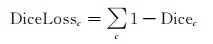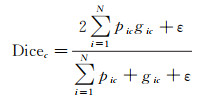 式中,pic、gic分别代表类别c的预测值和真实值, pic取值为[0, 1], gic取值为0或1;N为图像中的像素数;ε提供数值稳定性,防止分母为0。