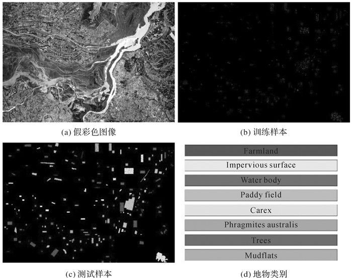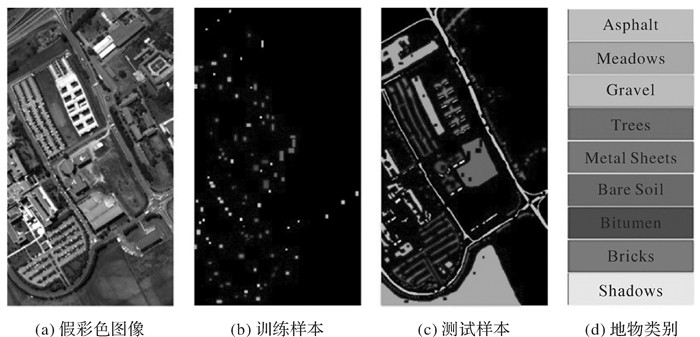 (1) PU数据集:由ROSIS传感器获取,空间尺寸为610×340像素,空间分辨率为1.3 m,包含103个波段,光谱范围为430~860 nm。数据集共包括9种地物类别,图 10(a)—(d)给出了该数据集的假彩色图像、训练样本分布图、测试样本分布图和类别名称。