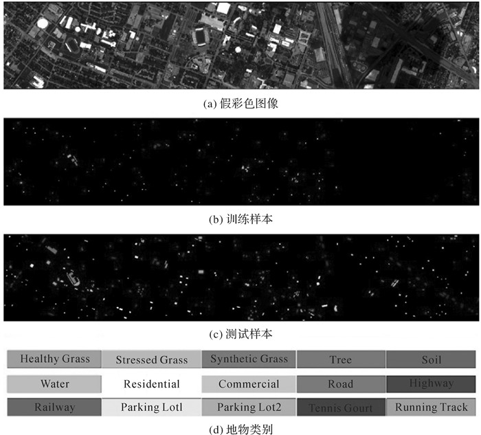 (2) HU数据集:由ITRES CASI-1500传感器获取,是2013年IEEE GRSS数据融合大赛提供(http://dase.grss-ieee.org/index.php),空间尺寸为349×1905像素,光谱范围为364~1046 nm共144波段。数据集共包括15种地物类别,图 11(a)—图(d)给出了该数据集的假彩色图像、训练样本分布图、测试样本分布图和类别名称。