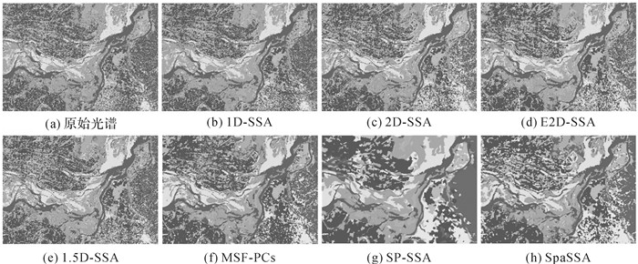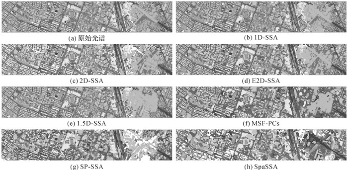 (2) 2D-MSSP:文献[50]结合多尺度2D-SSA和PCA(2D-MSSP)共同提取不同噪声水平下的判别特征。首先,将不同嵌入窗口大小的2D-SSA作用于HSI,得到多尺度的空间特征立方体。然后,对每个特征立方体进行PCA降维,得到低维的光谱-空间特征。2D-MSSP证明了在未校正的、包含严重噪声和吸水波段特征提取的有效性。然而,相比于MSF-PCs方法,2D-MSSP直接将多尺度2D-SSA用于原始影像处理,处理时间和成本较高。