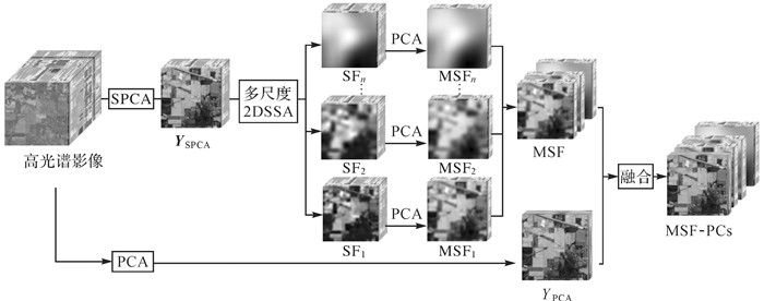(1) MSF-PCs:文献[42]联合多尺度2D-SSA、分割PCA(segmented PCA, SPCA)和PCA提出了MSF-PCs特征提取框架。首先,分别采用SPCA和PCA用于HSI光谱特征提取,PCA能够提取全局光谱特征而SPCA能进一步提取局部光谱特征。然后,在SPCA的降维图像上,采用不同嵌入窗口大小Li2D∈Ru×v(1≤i≤n)的2D-SSA进一步提取多尺度空间特征,其中n为尺度数,对得到的空间特征再次进行PCA降维并融合得到MSF。最后,将MSF与PCA的全局光谱特征进行堆叠融合,得到MSF-PCs光谱-空间特征,其处理流程如图 6所示。