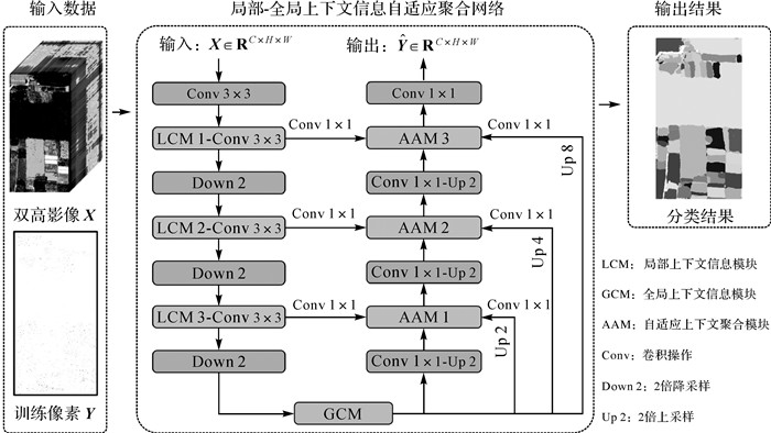 | 图 1 基于自适应上下文聚合的双高影像精细网络 Fig. 1 Flowchart of adaptive context aggregation network for H2 imagery classification |