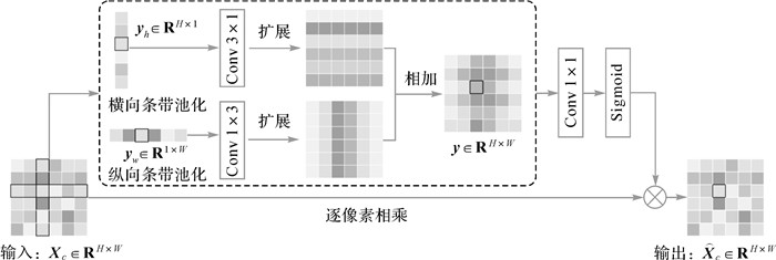 如式(2)所示,条带池化操作是对输入特征Xc的行或列中的所有特征值进行平均,因此其可以捕获每个像素长距离横向和纵向的上下文信息。式(1)中,W1×3和W3×1分别表示1维卷积,其分别捕获yh和yw邻域的特征;EH和EW表示对1维卷积输出的特征在横向和纵向进行扩展,使其与输入的特征图Xc尺寸一致;W1×1和σ表示对相加融合的扩展特征y使用1×1的卷积和Sigmod函数,最后将输出每个像素的编码权重与输入特征Xc进行逐像素加权。