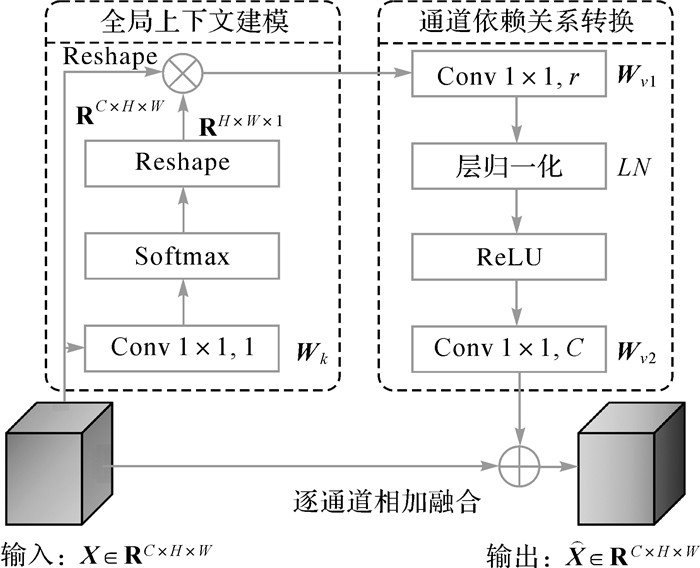 1.2 全局上下文信息模块全局上下文信息模块GCM对的网络结构如图 3所示,其假设全局上下文信息受空间位置影响较小,进而将全局上下文信息转换为通道之间的依赖[23]。GCM分为全局上下文建模、通道依赖关系转换和特征融合3部分。对于输入特征图X∈RC×H×W, 其输出的全局上下文特征图