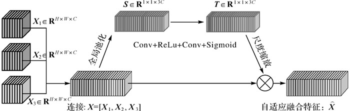 1.3 自适应上下文信息模块针对地物精细分类所需的场景不同,其对应的局部上下文特征和全局上下文特征对分类性能提升的重要性存在差异。基于此,本文提出自适应上下文信息模块AAM,引入通道注意力机制[24]实现表征底层细节的全局上下文特征和表征高级语义信息的全局上下文特征自适应融合。如图 4所示,该模块的输入包括3部分,分别是局部上下文特征X1、全局上下文特征X2和上一层输出的高级语义信息X3。随后,针对级联后的特征X=X1, X2, X3,首先通过全局平均池化操作建模全局空间信息,输出一维特征向量S∈R1×1×C,其公式可以表示为