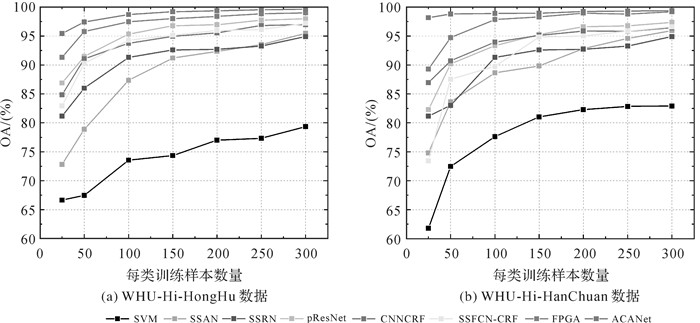 2.2 参数设置(1) 训练样本设置。如表 1所示,从每个类中随机选取50个标记像素进行模型训练,剩余的标记样本用于模型测试。训练样本占全部标注样本的比例非常小,仅为WHU-Hi-HongHu和WHU-Hi-HanChuan标注像素比例的0.28%和0.31。