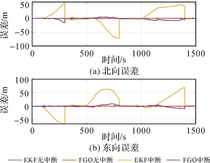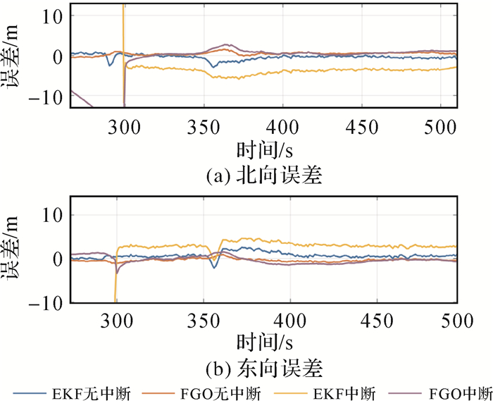 此外,在图 10中截取某段误差曲线放大可见,在信息源重新可用时,EKF产生了系统性偏差,误差曲线相较于未中断时出现偏移,而FGO可以更贴近无中断时的精度水平。