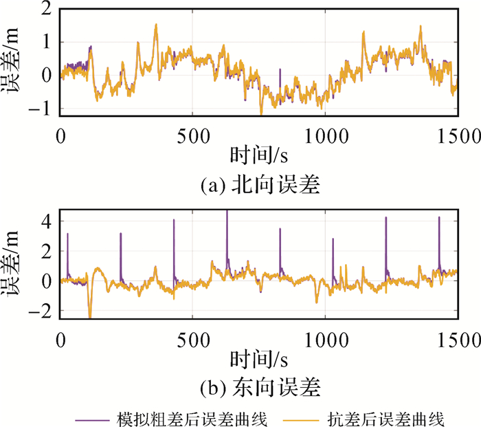 图 11为加入人工粗差但不进行处理与利用抗差FGO算法进行处理的误差曲线。可以看出,由于异常观测值的污染,FGO优化结果发生了偏移,且对前后一段时间内的定位结果造成了影响。利用DCS方法进行粗差处理,消除了异常偏移,有效平滑了误差曲线。