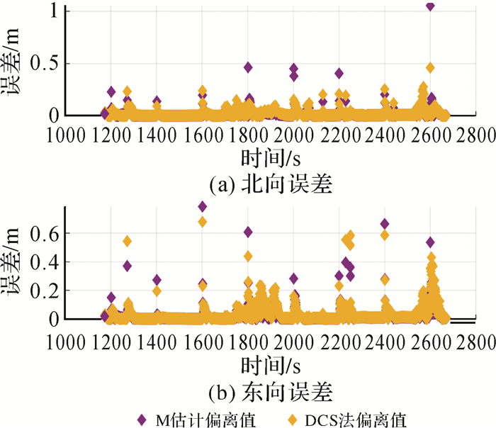 再利用M估计中的Cauchy方法进行抗差处理,与未加入人为粗差时的定位结果作差,抗差前后的偏离值如图 12所示,可见DCS算法削弱偏离值的效果总体上较好。