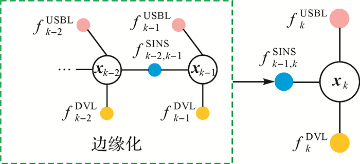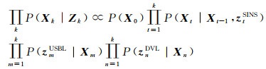 式中,P(X)表示所有变量的初始状态的先验信息;P(Xt|Xt-1, ztSINS)表示利用SINS递推的状态转移模型,P(zmUSBL|Xm)和P(znDVL|Xn)表示观测更新模型。状态变量的最大后验估计可表示为