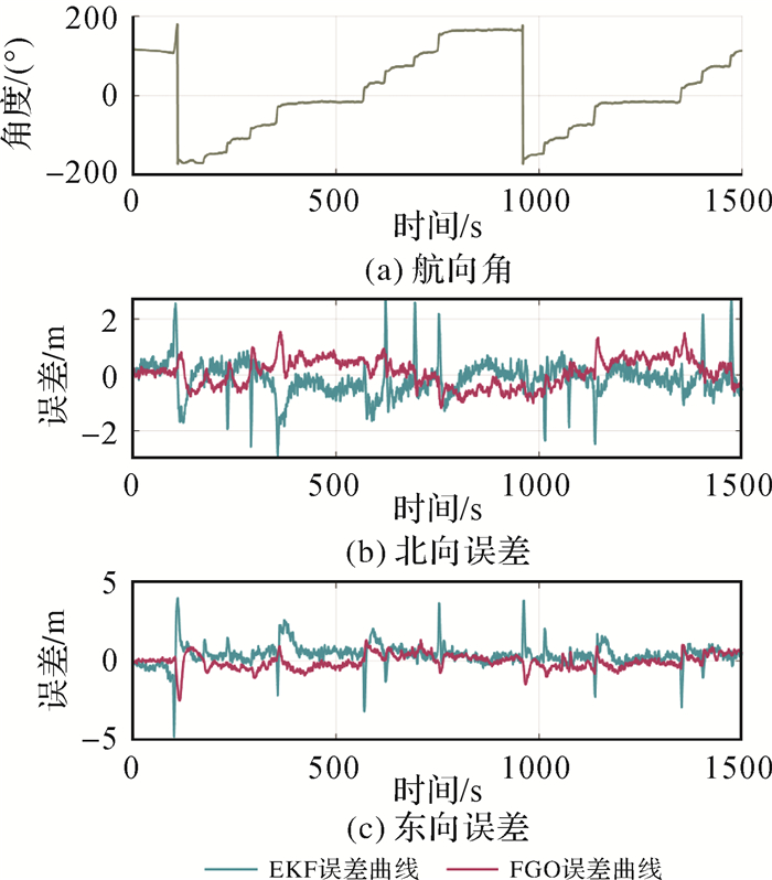 本文设计了两组试验,一是EKF与FGO算法的对比试验,分别采用EKF与FGO算法解算海测数据,综合对比两种算法性能,并模拟信号存在缺失的场景,验证FGO算法的定位精度与稳定性。