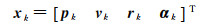 式中,pk和vk分别表示k时刻导航系下,即基准站北东地坐标系下的3轴坐标与速度。rk表示偏航、俯仰、横滚姿态角。αk表示陀螺仪与加速度计观测值的零偏。
