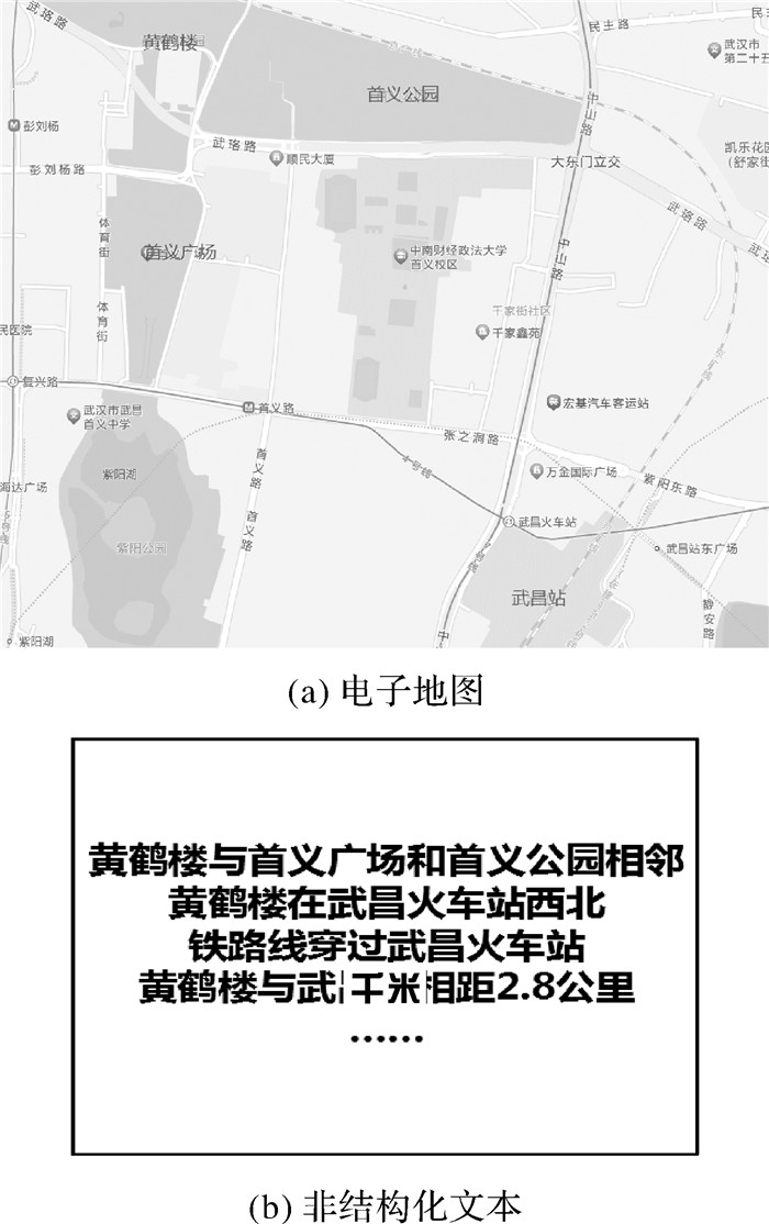 地理空间信息是对地理实体位置及相互关系的描述。如图 2所示,通常地理空间信息有两种表述方式。图 2(a)中,电子地图通过数字化点线面符号的方式将地理实体信息位置表达出来,通过函数关系计算得到地理实体间的距离、拓扑、方位等关系。图 2(b)通过非结构化文本的方式描述地理实体及相互关系。相比于图形结构的表达方式,自然语言的表述方式存在空间关系描述形式多样且涵义模糊不清等问题。