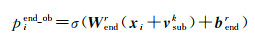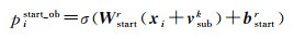 式中,pistart_ob和piend_ob表示将输入向量中的第i个字词分别识别为客体的开始和结束位置的概率;vsubk表示在主体抽取(sub)模块中检测到的第k个对象的编码表示向量。由式(12)在特定关系下从融合了主体特征信息的句子向量中抽取客体的概率
