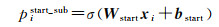 (3) 主体(subject)抽取[11]。主体抽取部分的主要作用是对BAB层获取到的词的隐层表示解码,构建两个二分类分类器,由式(6)和式(7)分别预测主体(subject)的开始(start)和结束(end)索引位置,对每一个词计算其作为start和end的一个概率,并根据设定的阈值,大于阈值则标记为1,否则标记为0。式(6)、式(7)如下