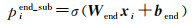 式中,xi为输入向量中第i个字词的编码表示,即xi= hN[i];W (·)为训练权值;b (·)为偏差;σ为sigmoid激活函数;pistart_sub是输入向量中第i个字词(token)为主体开始位置的概率;piend_sub是结束位置的概率。如果pistart_sub和piend_sub的概率超过了模型参数中设定的阈值,则pistart_sub、piend_sub的标记将被赋值1,否则赋值0。通过式(8)确定主体(subject)在x中的位置