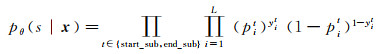 式中,L是句子的长度;yistart_sub是x中第i个标记的主体开始位置的标记,如果是则yistart_sub取1,否则取0;yiend_sub表示主体结束位置,取值同理;参数θ={ Wstart, bstart, Wend, bend}。