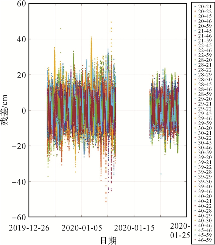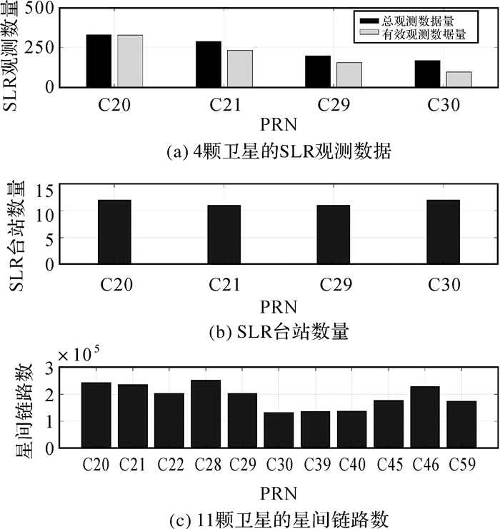 本文选取的观测数据时间为2019年12月29日至2020年1月23日。图 1为4颗卫星的SLR观测数据、SLR台站数量和11颗卫星的星间链路数,由图 1(a)可以看出,C30有效数据不足100个。由图 1(b)可以看出,在选取的时间跨度内,能够观测到C20和C30卫星的SLR台站数量均为12个,观测到C21和C29卫星的SLR台站数量均为11个。由图 1(c)可以看出,与C30、C39和C40有关的星间链路数据量较少。