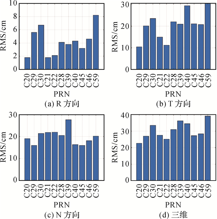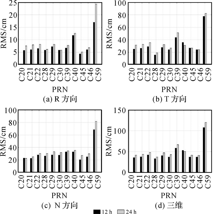 (3) 轨道预报精度分析表明MEO卫星12 h和24 h径向精度优于7.0 cm,三维精度40.0 cm左右;GEO卫星12 h和24 h径向精度分别约为17.0 cm和24.3 cm,三维精度约为1 m;IGSO卫星径向约为10.0 cm,三维精度优于60 cm。
