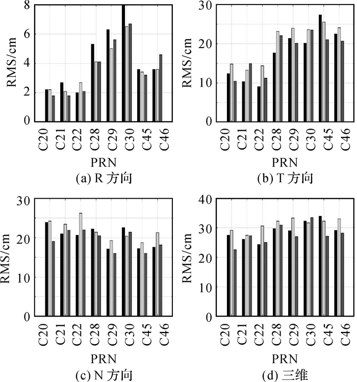 | 图 11 3组试验得到的MEO卫星轨道重叠差异RMS Fig. 11 RMS of Overlap comparision of orbits for MEO stallites in three experments |