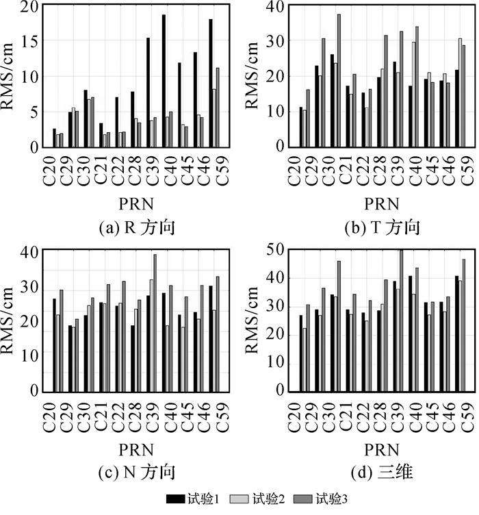图 3为3组试验轨道重叠差异的RMS,表 4为对3种类型卫星轨道重叠差异的RMS均值。由图 3和表 4可以看出,试验2和试验3得到的卫星轨道径向精度优于试验1得到的卫星轨道径向精度,试验1和试验2得到的卫星轨道三维位置精度优于试验3得到的卫星三维位置精度。因此本文精密定轨中,11颗卫星全部采用ECOM 5参数模型。