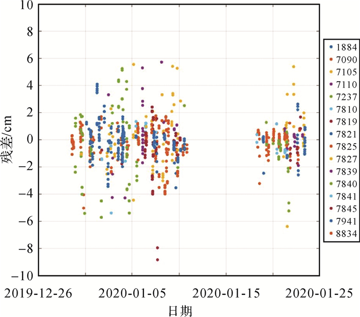 本文采用2019年12月29日至2020年1月23日星间链路及全球SLR跟踪站的观测数据对11颗卫星进行精密定轨,相邻两个弧段有12 h的重叠时间,每个定轨弧段时间跨度、SLR观测数据量和台站数见表 5。1月11日至1月14日SLR观测数据量和台站数量少,1月15日至1月17日缺少SLR观测数据,因此剔除1月12日至1月17日数据。