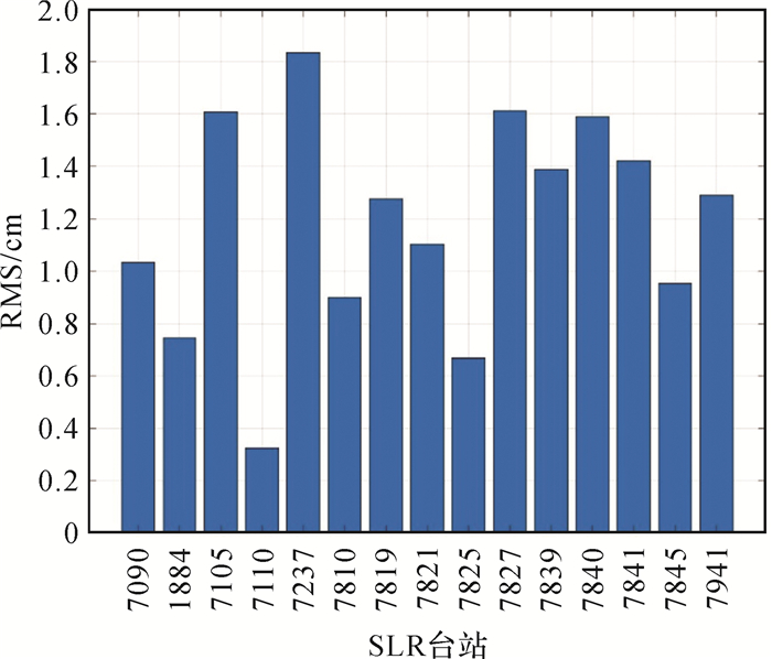 人卫激光测距(satellite laser ranging, SLR)通过精确测定激光脉冲从地面观测点到装有反射器卫星的往返时间间隔,算出地面观测站至卫星的距离。基于其观测原理,SLR测距精度可达1 cm,并且SLR技术不受载波相位模糊度、钟差等影响,应用于大地测量的SLR卫星多为球形,面积质量比小,与非重力相关的轨道扰动小。SLR作为一种独立于GNSS观测技术的测量手段,在卫星定轨研究中发挥着重要作用,一方面由于SLR观测对卫星的径向位置最敏感,可以利用SLR对卫星定轨精度进行校验[7-9], 另一方面采用单SLR数据对卫星精密定轨,BDS卫星定轨精度约为米级[10-11]。文献[12]采用2014—2017年期间ILRS组织的3次SLR跟踪GNSS卫星的加强观测数据,对各GNSS系统卫星精密定轨,在SLR台站和观测数据足够多的情况下,MEO卫星精度可以达到厘米级。由于SLR地面观测台站较少,分布不均匀及观测数据量少等原因,与GNSS技术相比,采用单SLR数据的卫星定轨精度较差,SLR联合GNSS则有助于提高轨道精度[13-16]。由于SLR技术的特点,其在地球参考框架、尺度、地心运动和地球重力场的研究中也具有独有的优势[17-20],目前国际大地参考框架(ITRF2014)的尺度和地心通过SLR对LAGEOS和ETALON卫星的观测得到[21]。国内外学者已经开展采用SLR联合GNSS技术的研究[19-24],但是GNSS技术在数据处理时会受到天线相位中心、太阳辐射压和模糊度等因素的影响[25-27]。