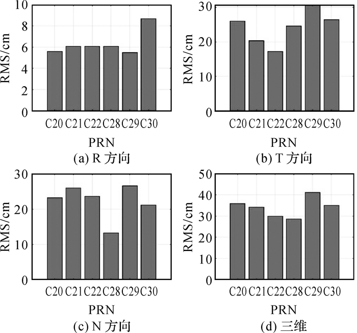 定轨残差是定轨精度和可靠性的重要内部验证手段,是检验定轨内符合精度的重要手段。11颗卫星不同链路测距数据的定轨残差时间序列如图 4所示,可以看出,大部分时段的链路定轨残差在±20 cm以内波动。图 5为不同链路定轨残差的RMS,可以看出,大部分链路的RMS小于5 cm。表 6为每颗星所有链路的定轨残差RMS值,可以看出11颗星RMS均值为4.8 cm, MEO、IGSO和GEO卫星RMS分别为4.6、4.9和5.9 cm,3种类型卫星定轨残差相当。C30的残差偏大,这可能与激光观测数据及星间链路数据量有关。文献[6]采用星地伪距相位数据和星间链路数据联合对8颗BDS-3 MEO卫星精密定轨,星间链路定轨残差的RMS小于6.0 cm。文献[8]计算的星间测距数据残差的RMS优于8.0 cm,两颗同轨道的MEO卫星RMS最小为4.7 cm。两篇文献中MEO卫星残差的RMS与本文MEO卫星定轨残差RMS值相当。