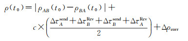 式中,ρ(t0)为t0时刻A、B两颗星的相对距离,该距离即为本文SLR和星间链路联合定轨的观测数据;ΔτAsend和ΔτARcv分别为A星的发射时延和接收时延;ΔτBsend和ΔτBRcv分别为B星的发射时延和接收时延;Δρcorr为单向测距中可精确建模的误差改正,包括卫星天线相位中心和相对论效应等。
