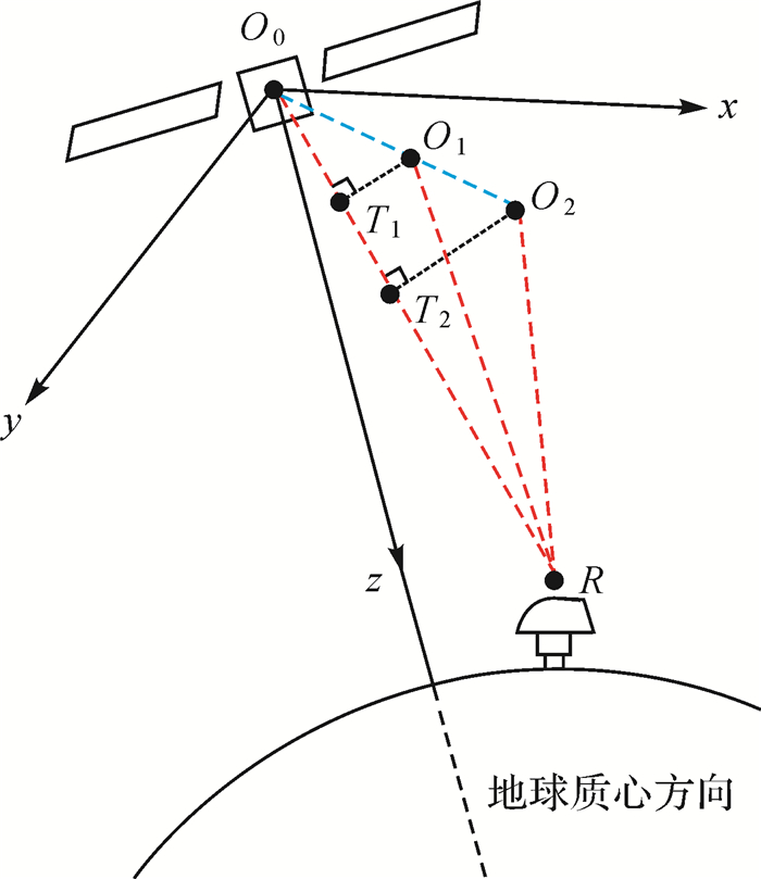 图 1中,星固系下卫星的z轴指向地球质心,y轴与卫星太阳能板平行,x轴与其他两轴构成右手系[16];O0表示卫星质心,O1表示频率f1的相位中心,O2表示频率f2的相位中心;R表示地面接收机。
