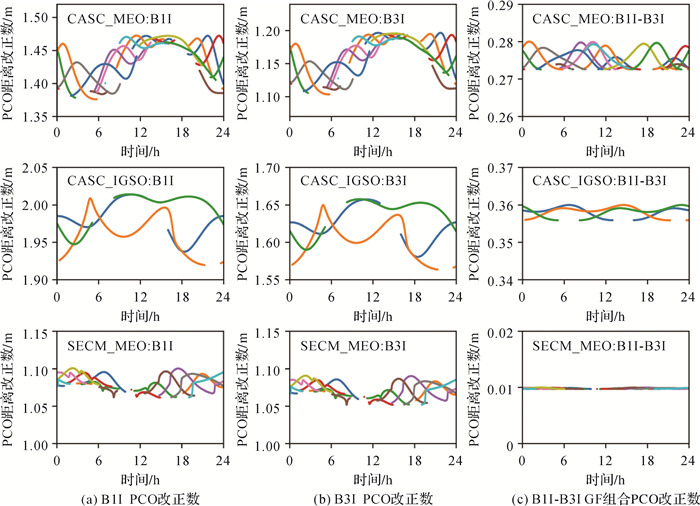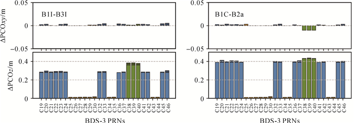 | 图 2 BDS-3 B1I-B3I和B1C-B2a GF组合的PCO标定值之差 Fig. 2 PCO differences of BDS-3 B1I-B3I and B1C-B2a GF combinations |