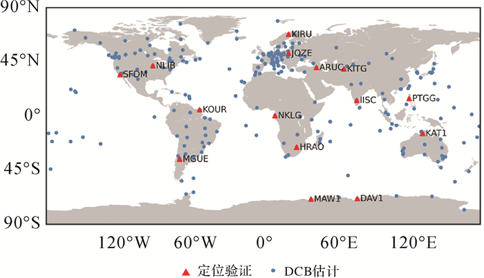 | 图 4 用于DCB参数估计(蓝色)与验证(红色)的MGEX站分布情况 Fig. 4 Distribution of the selected MGEX stations used for BDS-3 DCB estimation (blue) and validation(red) |