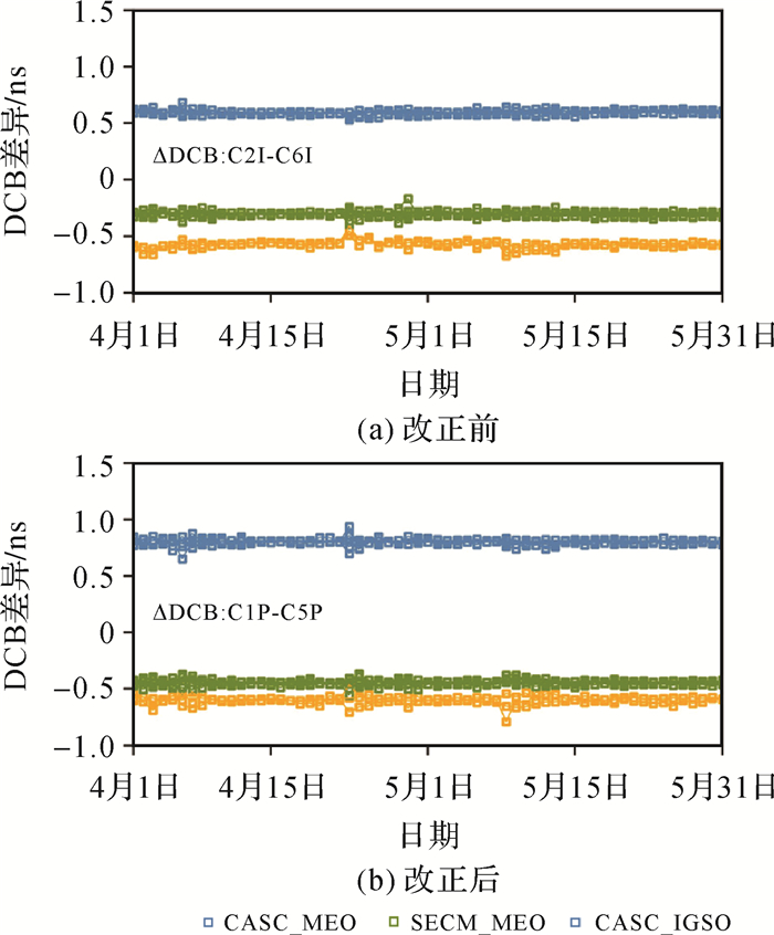 分析时段内,PCO改正前后的DCB差异统计结果及其与理论近似值(表 1)之间的互差见表 3。由于理论值的推导过程忽略了PCO改正数的天内变化特性和观测噪声的影响,各类卫星PCO改正前后的DCB实际差异值与理论值存在一定偏差,最大偏差为0.038 ns,最小偏差为0.001 ns;总体而言,二者之间的一致性较强。需要说明的是,PCO误差引起的不同类型卫星之间的DCB差异较大;以C2I-C6I DCB为例,CASC_MEO与SECM_MEO卫星之间的差异约为0.90 ns,而CASC_IGSO与SECM_MEO卫星之间的差异可达1.17 ns。不同卫星之间的DCB差异在标准定位中难以被公共项参数(接收机钟差)吸收,对定位精度造成的影响不可忽略;而在非组合精密定位中,卫星特定的电离层参数和模糊度参数将吸收包含卫星硬件延迟在内的卫星相关偏差项[25-27],对电离层提取及模糊度固定等应用造成不利影响。