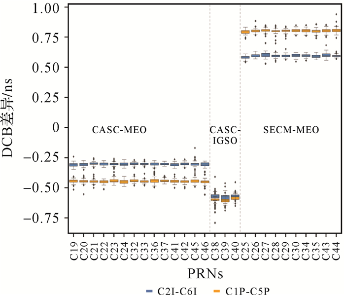 图 6给出了PCO改正前后BDS-3卫星C2I-C6和C1P-C5P DCB差异的箱线图。受可用基站分布以及卫星数量影响,不同类型DCB参数对应的IQR(interquartile range)值存在一定差异:改正PCO前后,MEO卫星DCB异常值数量和偏离程度总体较小;IGSO卫星(C38—C40)DCB表现出较大的异常值,且箱体略宽于MEO卫星。可以看出,PCO改正前后DCB差异的统计结果,符合PCO误差在GF组合观测中的基本量级和变化特性,不同参数和不同卫星间仅存在毫米至厘米级的波动,整体稳定性较强。