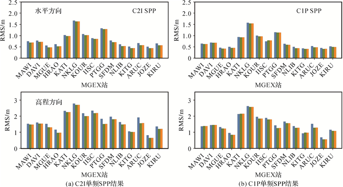 | 图 7 不同基准站BDS-3 C2I及C1P单频SPP精度统计结果 Fig. 7 Performance of BDS-3 C2I and C1P SPP at individual test stations |