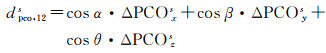 式中,α表示质心视线方向与x轴的夹角;β和θ相应的表示与y轴和z轴之间的夹角;ΔPCOxs表示两个频率在x轴方向的PCO标定值之差;ΔPCOys和ΔPCOzs则分别对应y轴和z轴的PCO标定值。